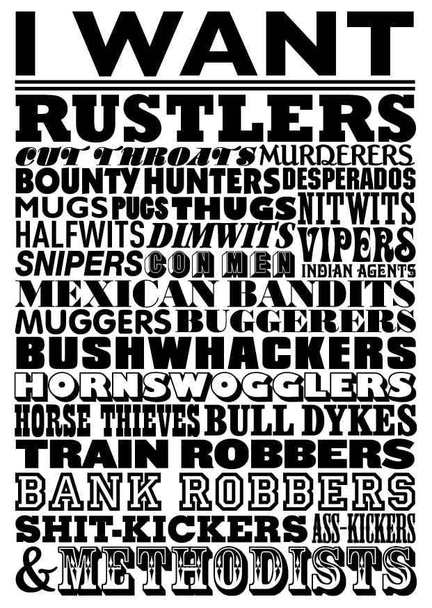 "I want rustlers, cut throats, murderers, bounty hunters, desperados, mugs, pugs, thugs, nitwits, halfwits, dimwits, vipers, snipers, con men, Indian agents, Mexican bandits, muggers, buggerers, bushwhackers, hornswogglers, horse thieves, bull dykes, train robbers, bank robbers, ass-kickers, shit-kickers and Methodists."